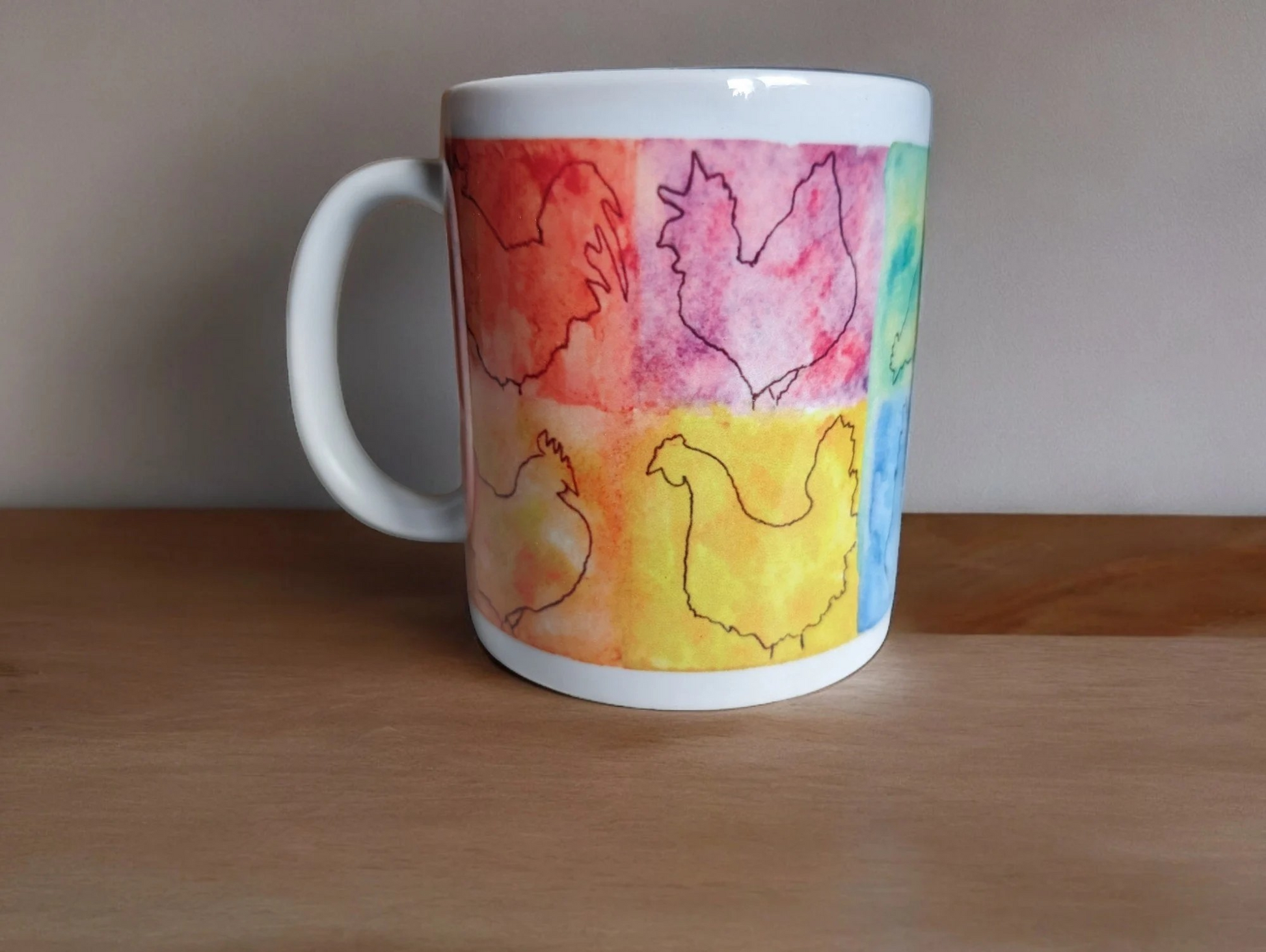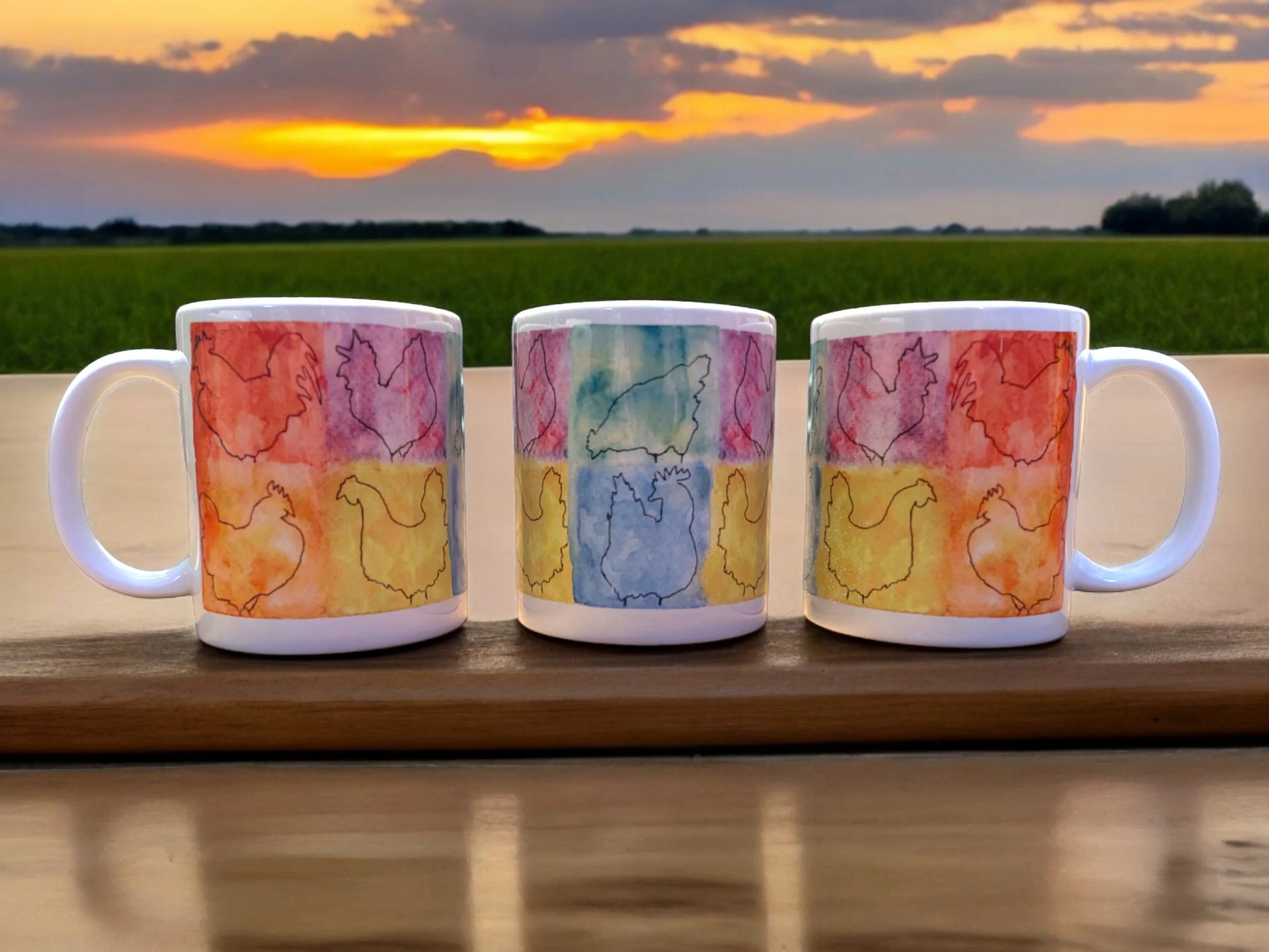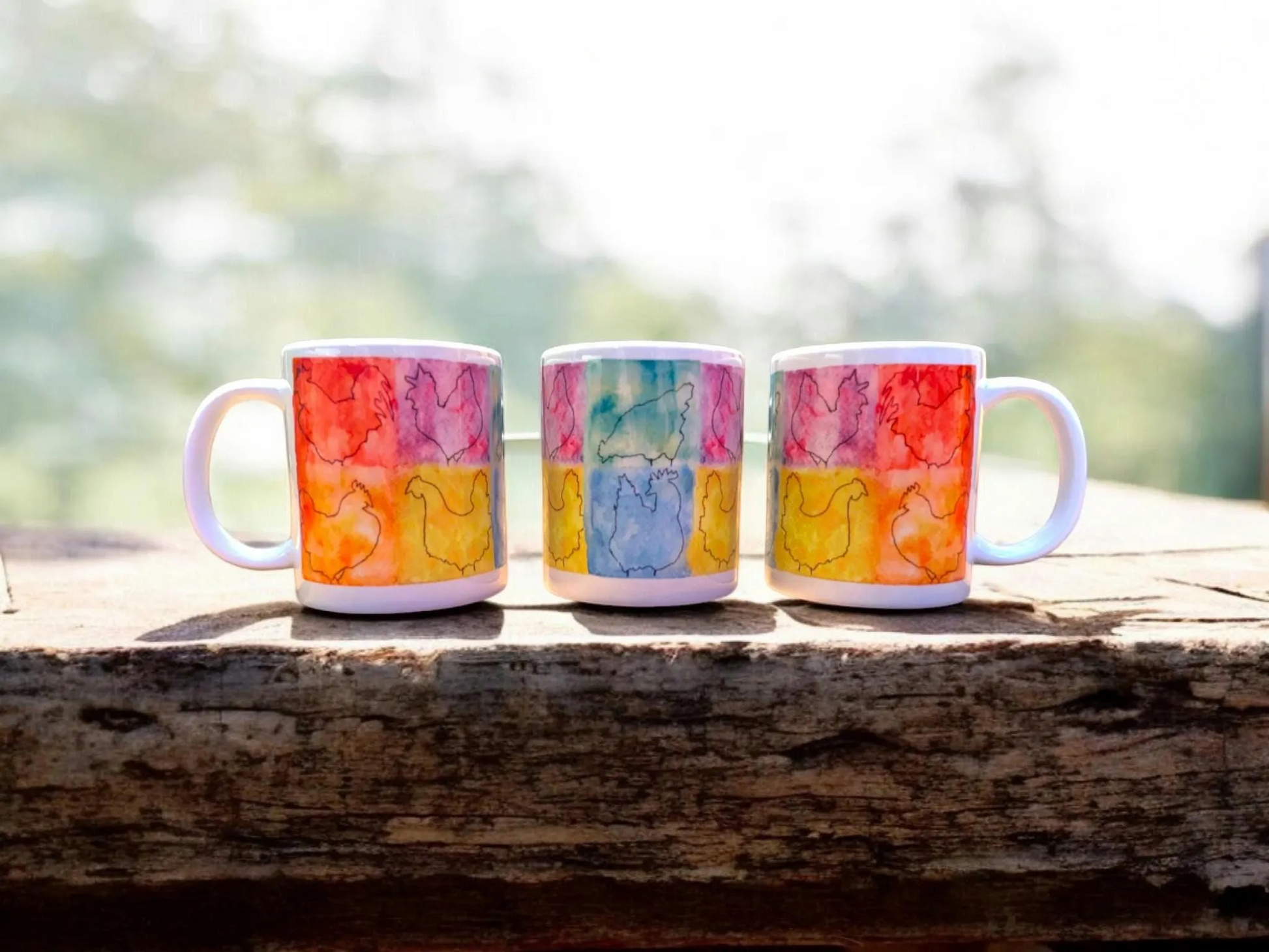 Add a splash of color and fun to your morning routine with the Rainbow Checkered Chicken Mug. This vibrant mug features a playful design with three colorful squares, each showcasing a simple yet striking outline of a chicken. The bold, rainbow hues add a cheerful touch to your coffee, tea, or favorite beverage, while the minimalist chicken outlines bring a charming farm-inspired flair.