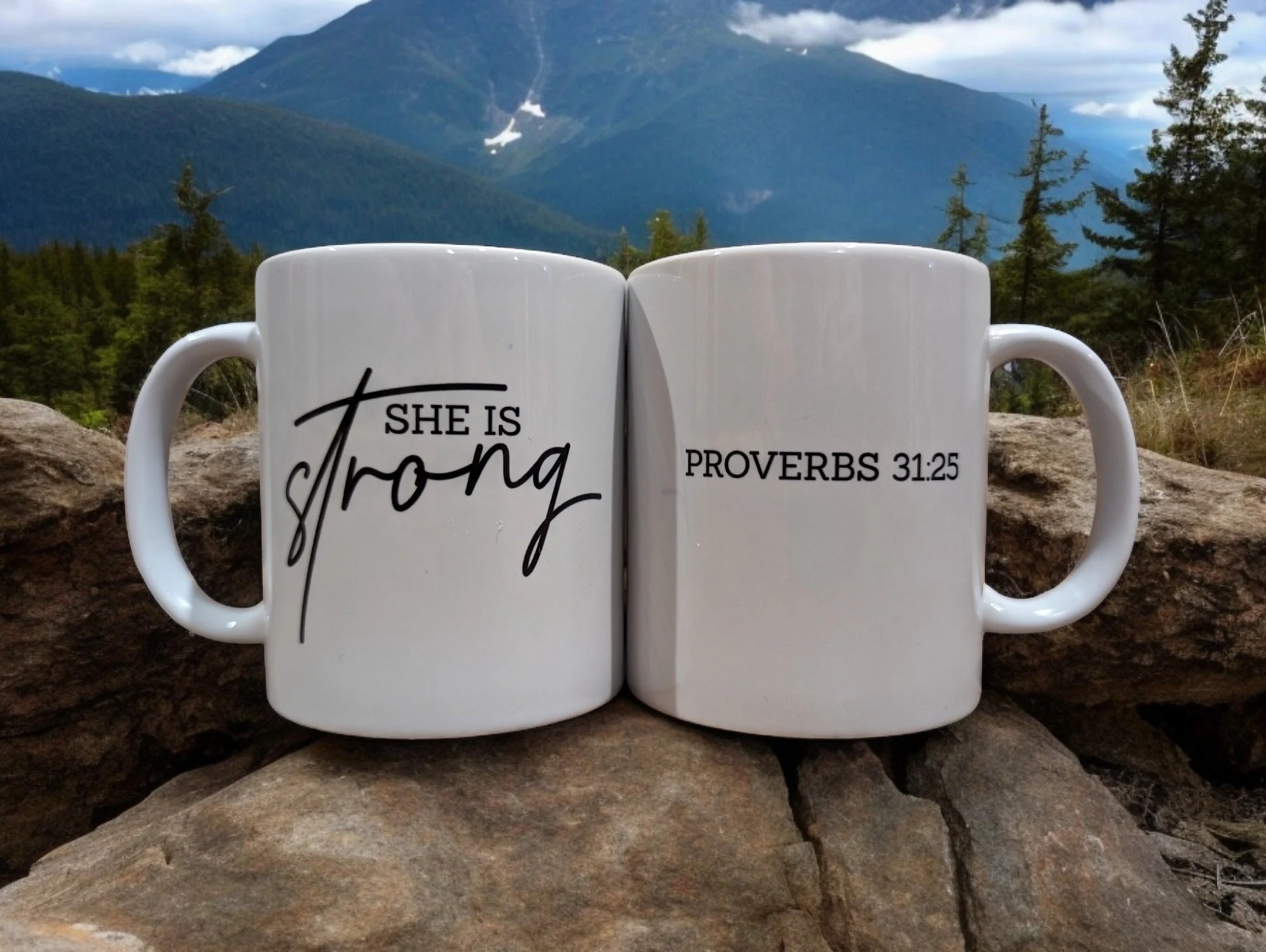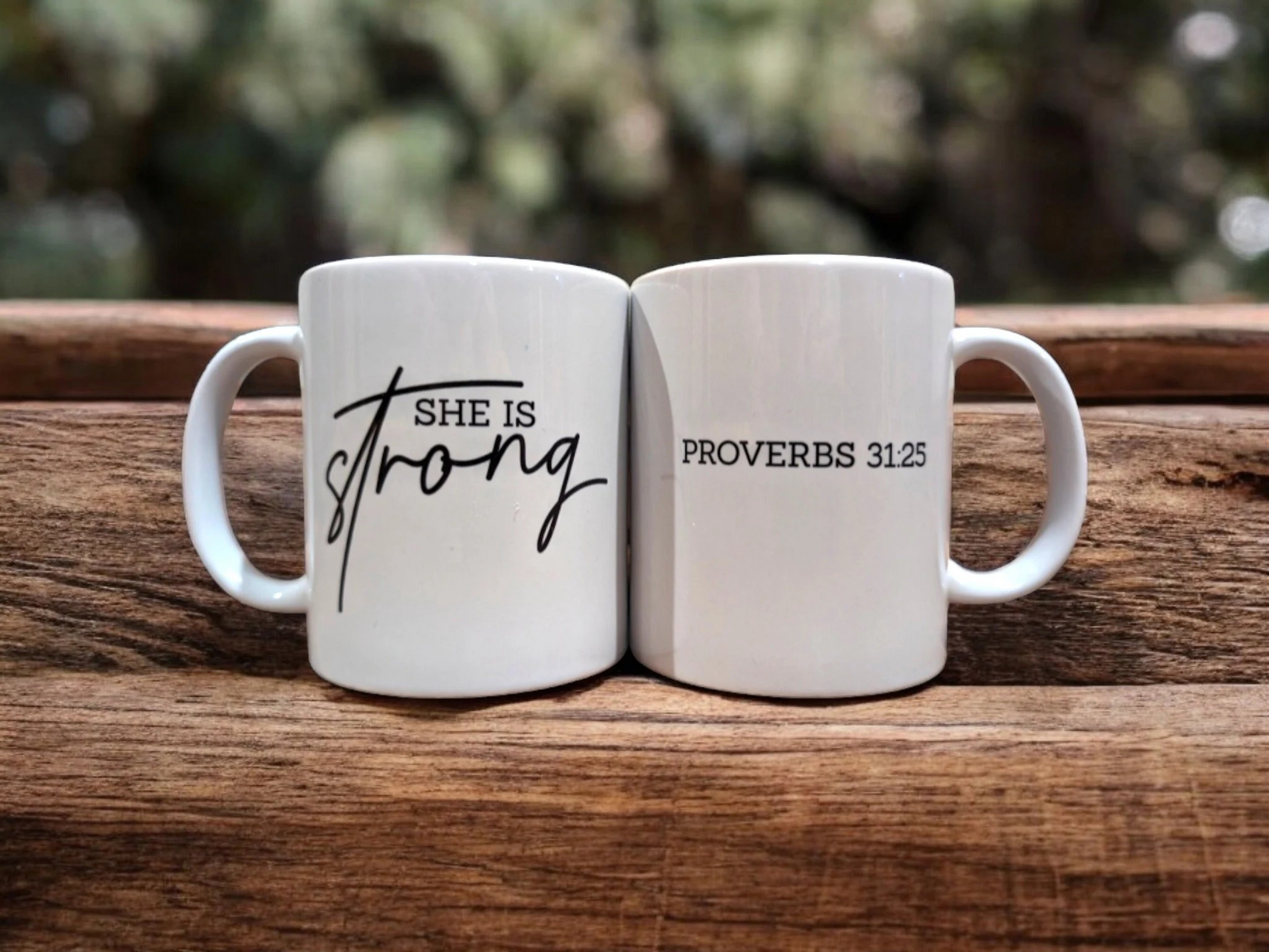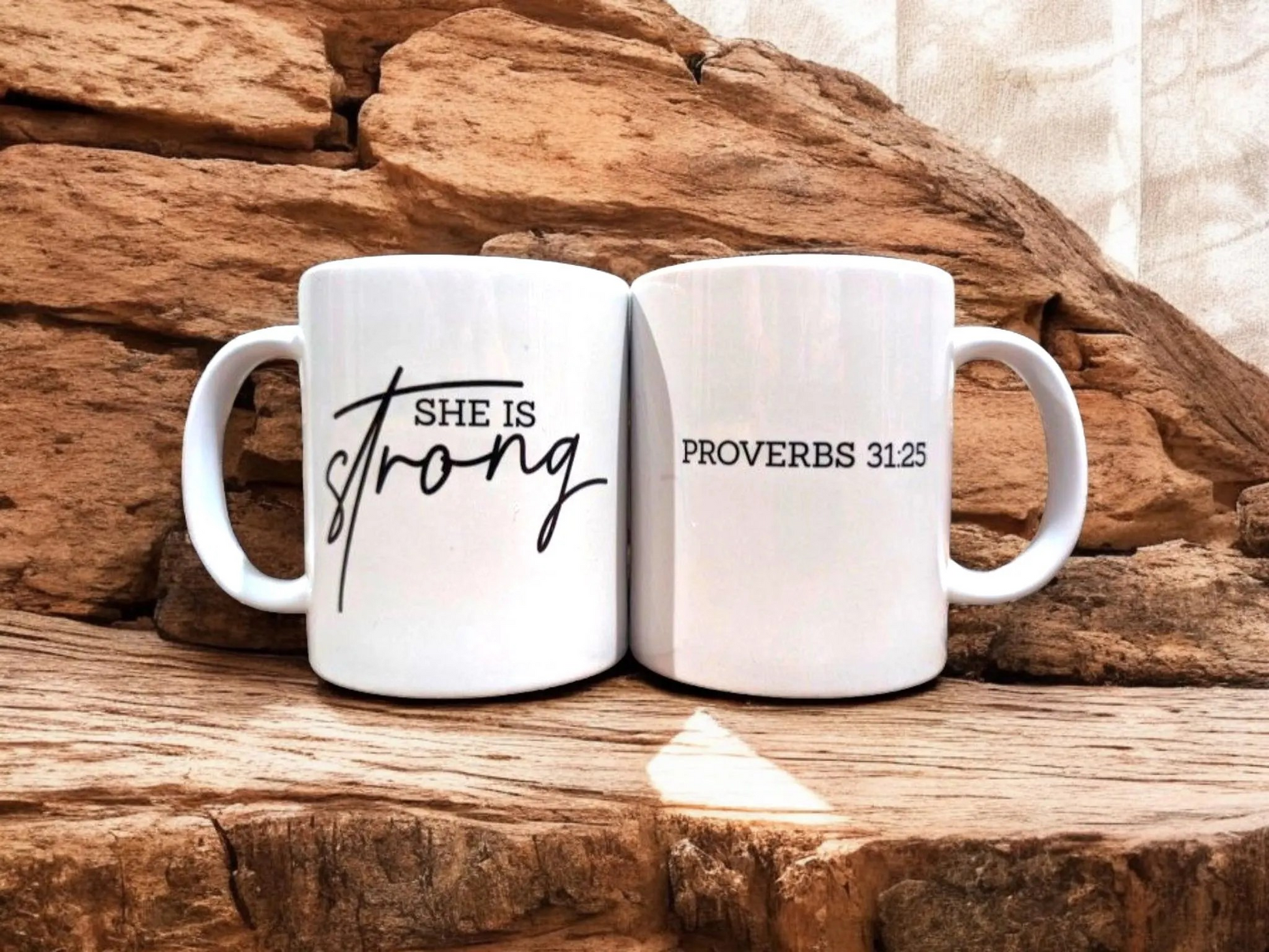 Carry the strength and wisdom of scripture with the She is Strong Mug—your new daily reminder of inner power and faith.