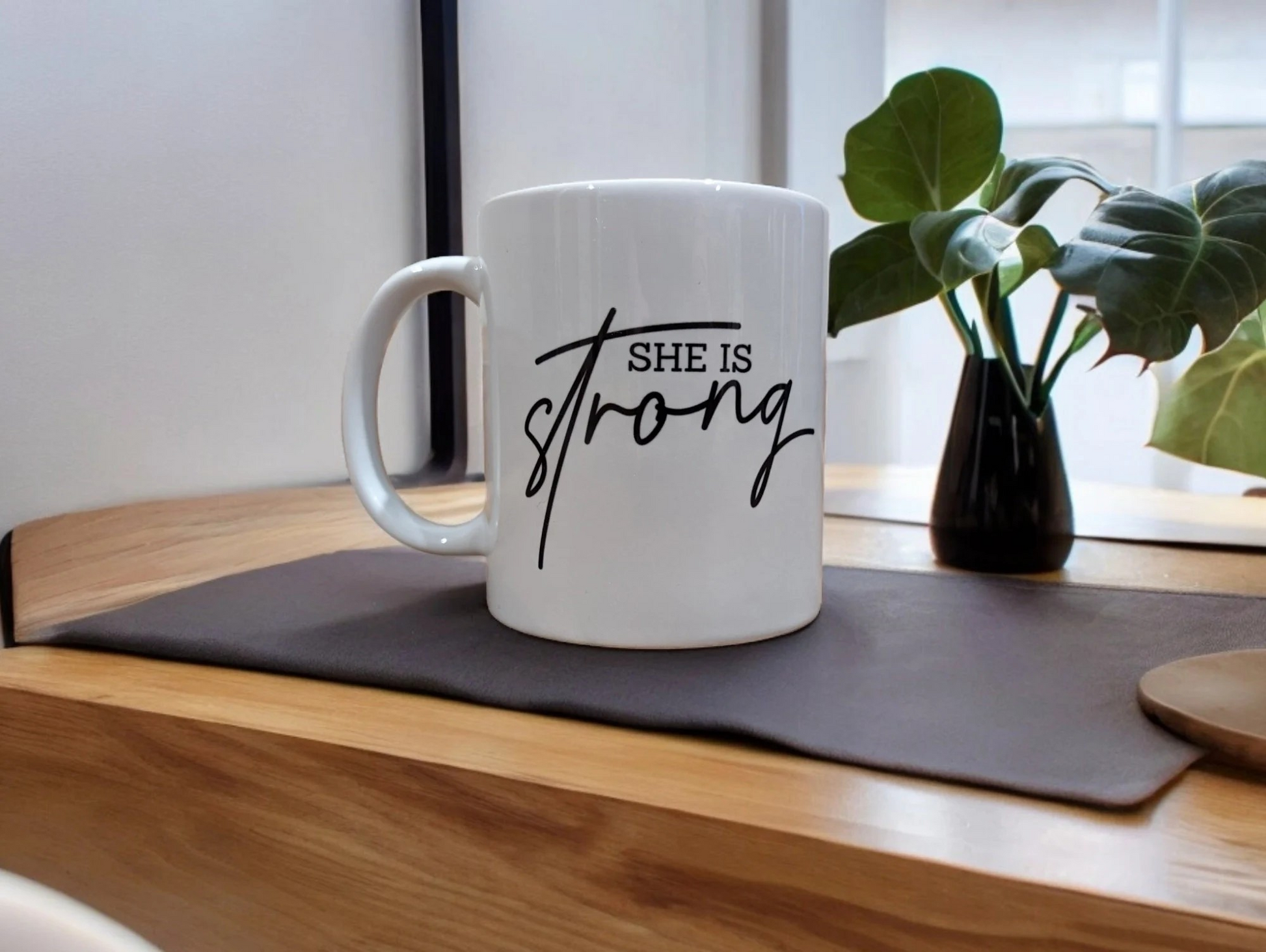 Crafted from high-quality ceramic, the She is Strong Mug is ideal for coffee, tea, or any beverage that fuels your day. Whether for personal use or as a meaningful gift, it brings a sense of purpose and beauty to your daily routine.
