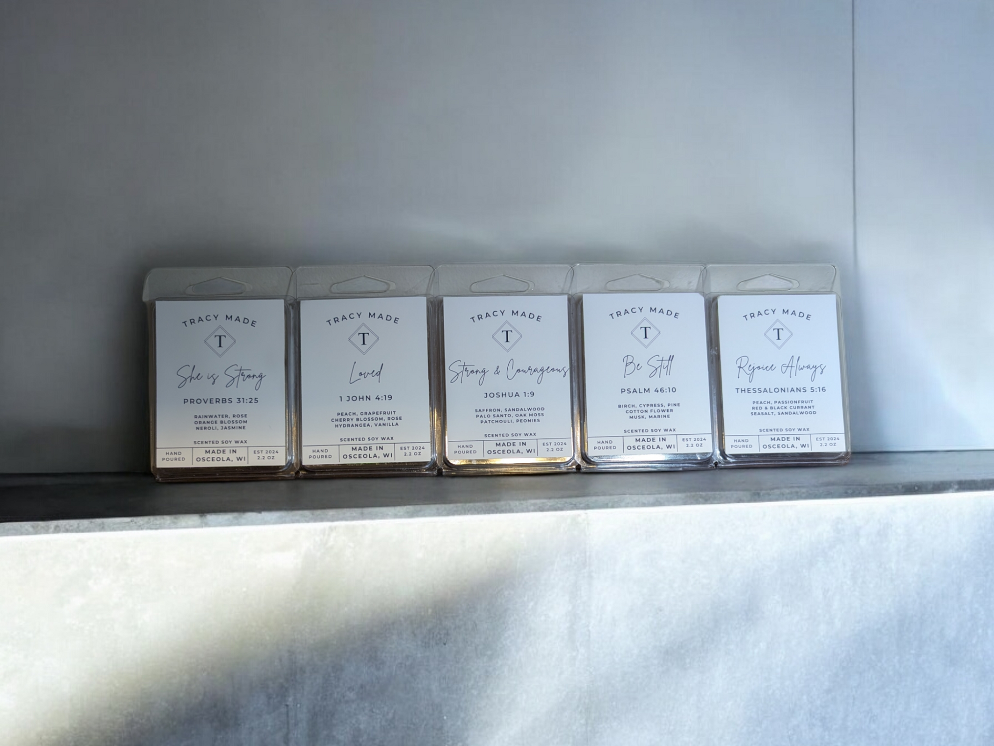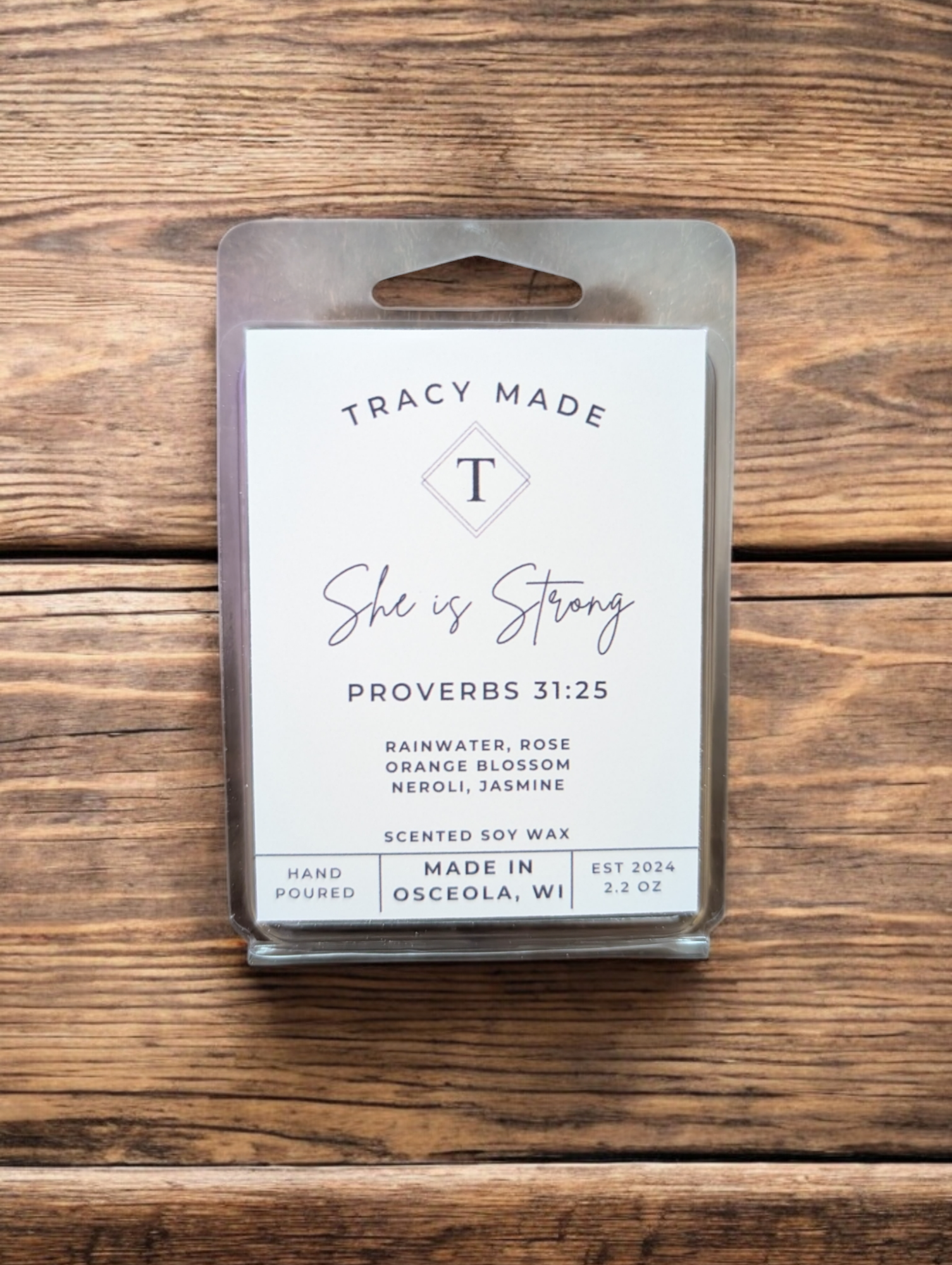 Embrace the empowering strength of faith with the She Is Strong Wax Melt, inspired by the uplifting words of Proverbs 31:25: "She is clothed with strength and dignity, and she laughs without fear of the future." Crafted with a premium soy wax blend, this wax melt gently releases a captivating aroma that transforms your space into a sanctuary of inspiration and grace. Simply place a melt in your favorite wax warmer and let the fragrance bloom, inviting moments of meditation and reflection.