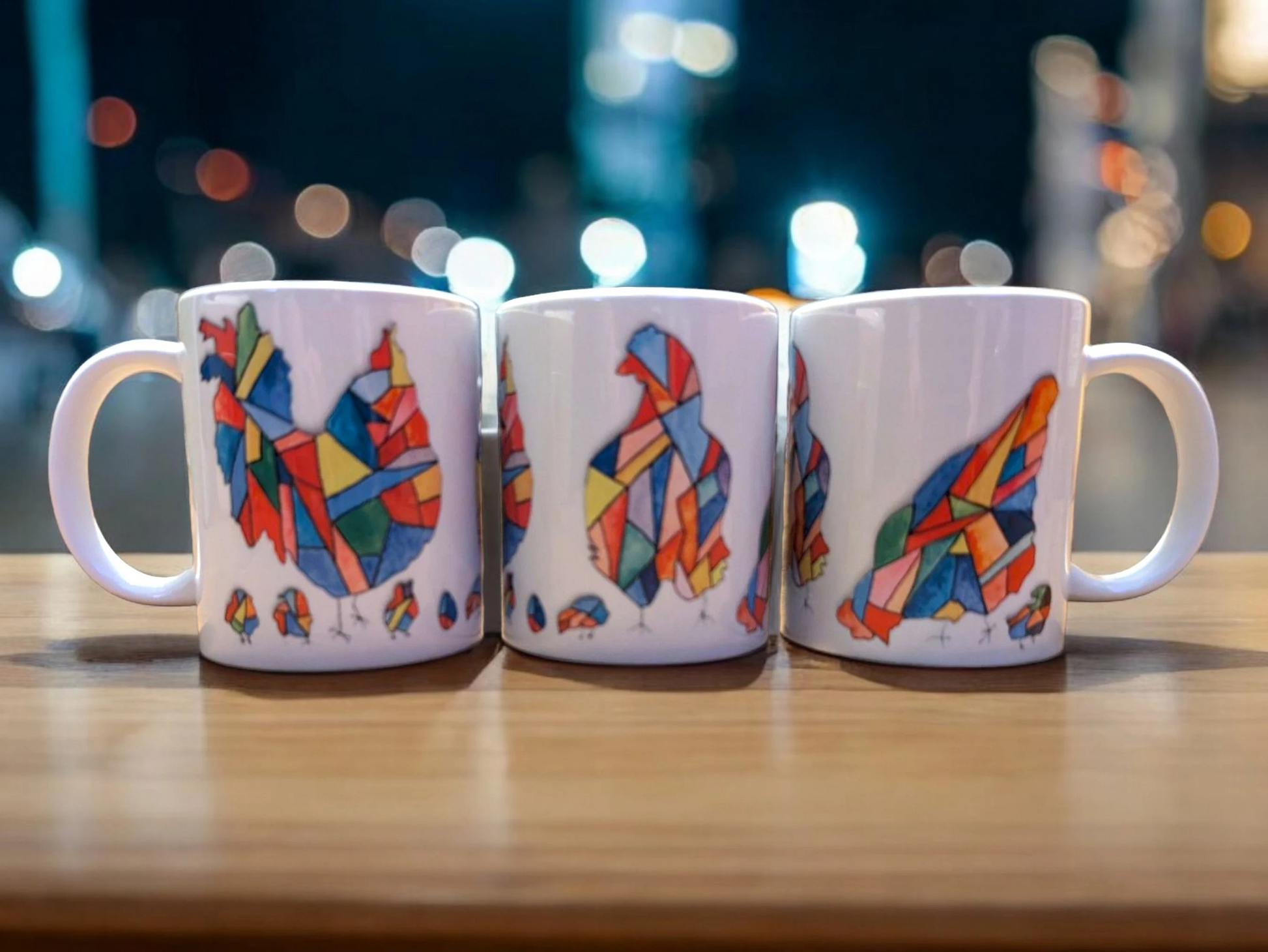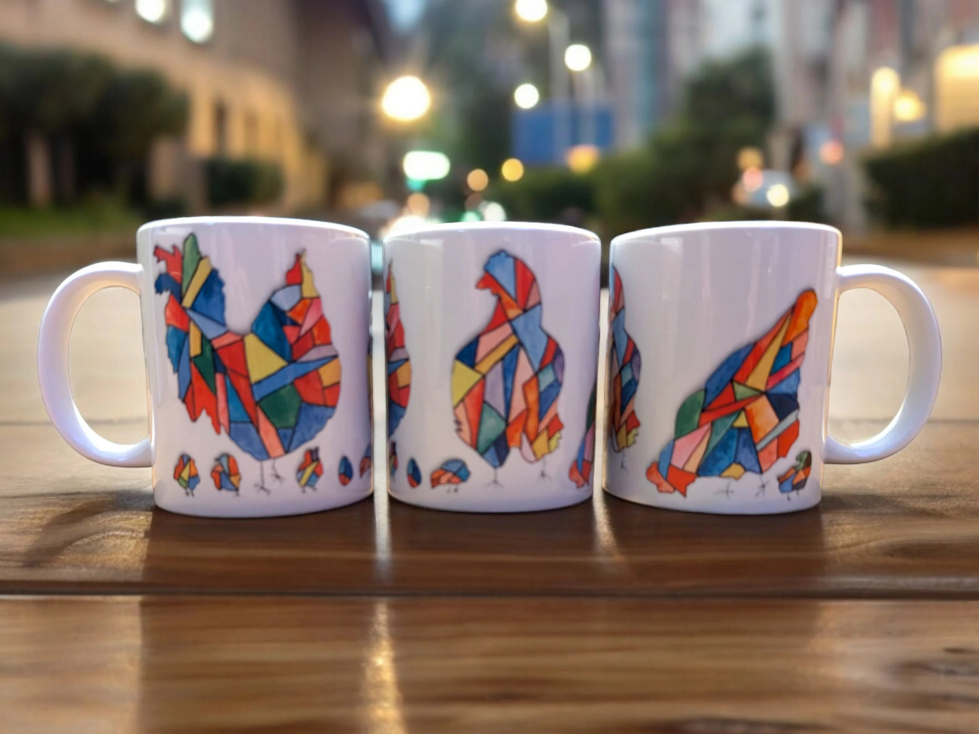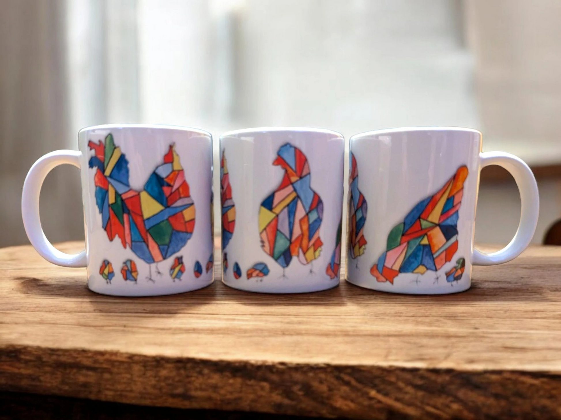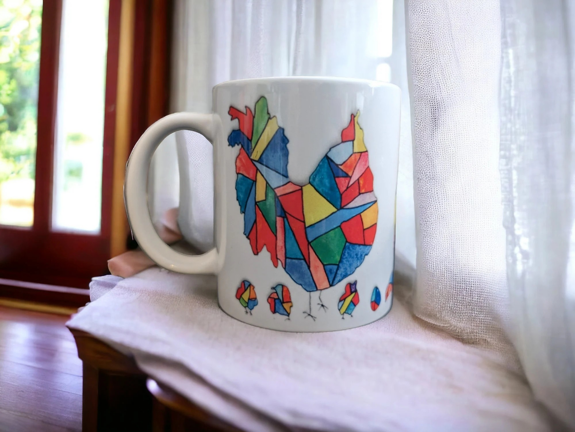 Bring a touch of elegance and charm to your mornings with the Stained Glass Chickens Coffee Mug. This delightful mug features a vibrant and unique design showcasing one proud rooster, two graceful hens, and a playful brood of chicks. Each character is brought to life with bold, colorful geometric shapes that resemble the beauty of stained glass, creating a truly eye-catching piece of art. The artwork is a recreation of an originally hand-painted design by a local artist and chicken enthusiast.